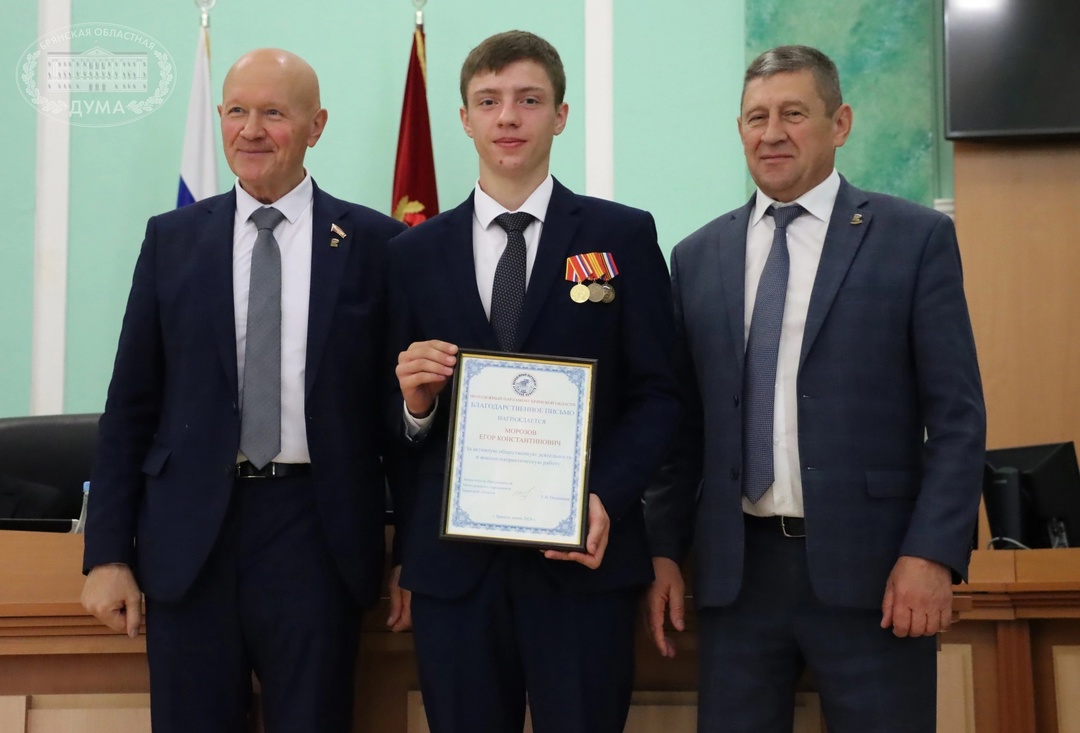 За активную общественную деятельность и военно-патриотическую работу Благодарственным письмом Молодёжного парламента Брянской области был отмечен заместитель председателя Молодёжного Совета Дубровского района Морозов Егор Константинович.