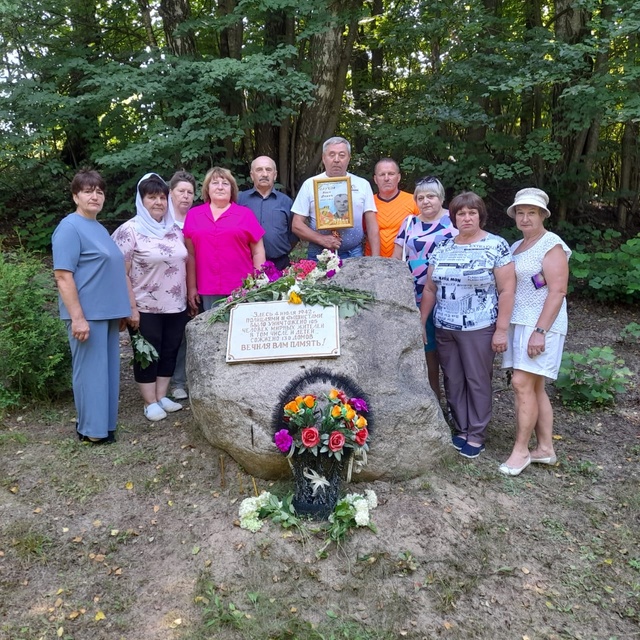 Присутствующие — работники администрации, культуры, учителя школы, родственники погибших — почтили память расстрелянных минутой молчания и возложили цветы.