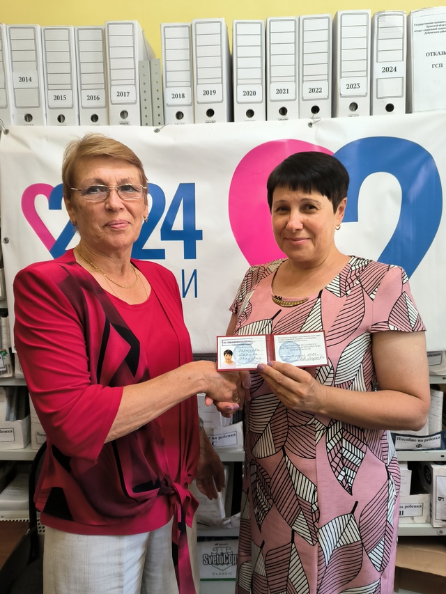 Специалист сектора пособий и компенсаций Андрюшина Н.А вручила ветеранам удостоверения, поздравила с получением нового социального статуса, пожелала крепкого здоровья, долголетия и семейного благополучия.