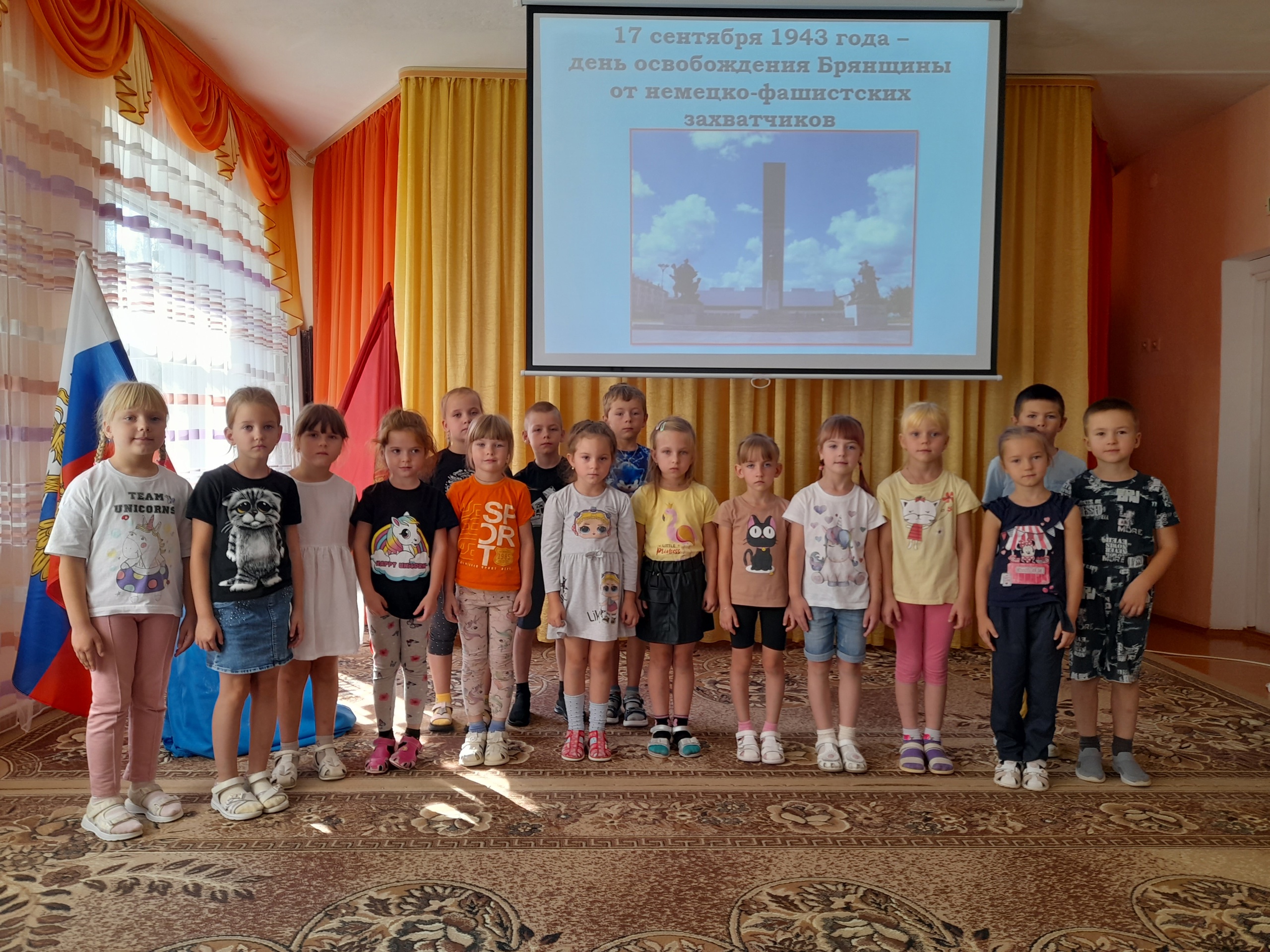 17 сентября в МБДОУ Дубровском детском саду №2 «Ромашка» педагоги подготовили и провели тематическое мероприятие, посвящённое Дню освобождения Брянщины от немецко-фашистских захватчиков «Шумел сурово брянский лес…». Ребята узнали о героической борьбе брянских партизан, солдатах, сражавшихся на фронте за освобождение родного края, на старых фотографиях увидели измученные и счастливые лица мирных жителей, встречающих своих освободителей. В завершение все почтили память павших героев Минутой молчания.