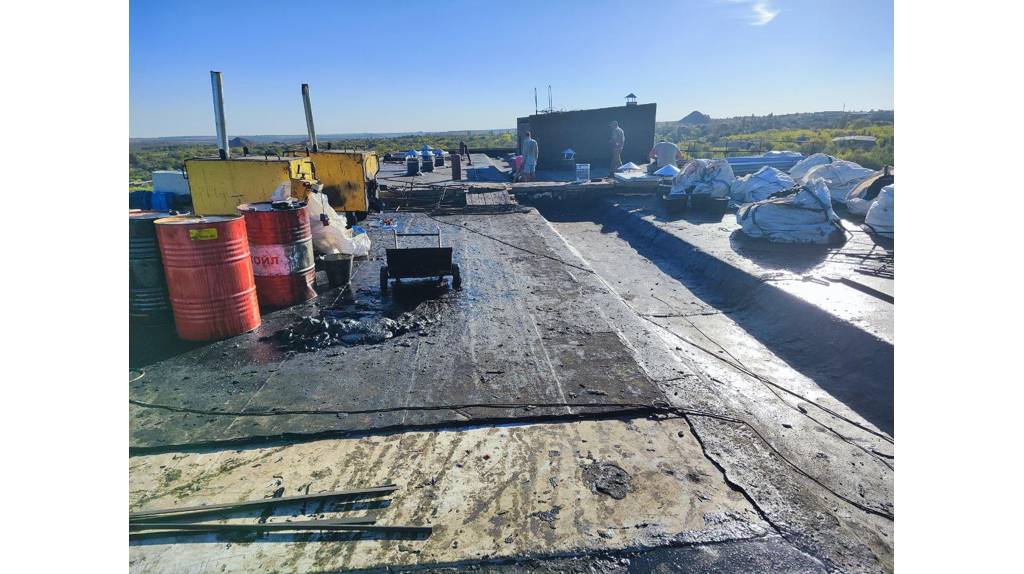 Полностью залит первый слой наплавляемого материала, смонтирован верхний наплавляемый бронированный слой. Ведутся работы по закрытию парапетов оцинкованной сталью.