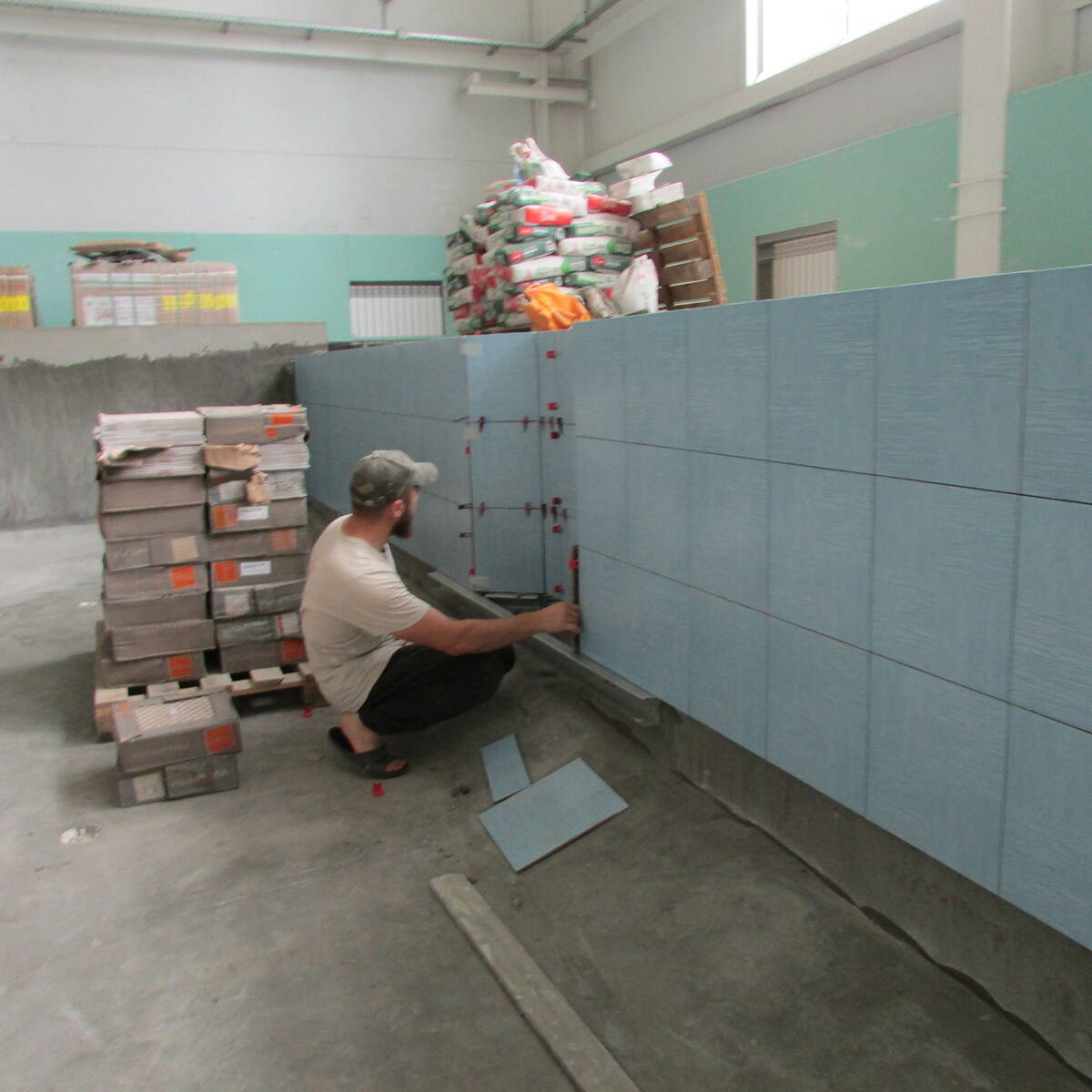 Вдоль стен с окнами в бассейне сделали перегородки, которые предстоит оштукатурить и покрасить влагостойкими красками и установить решетки на радиаторы системы отопления. В раздевалках, душевых, санузлах бассейна сантехники завершают установку и монтаж фаянсовой сантехники. Начаты работы по монтированию системы водоподготовки.
