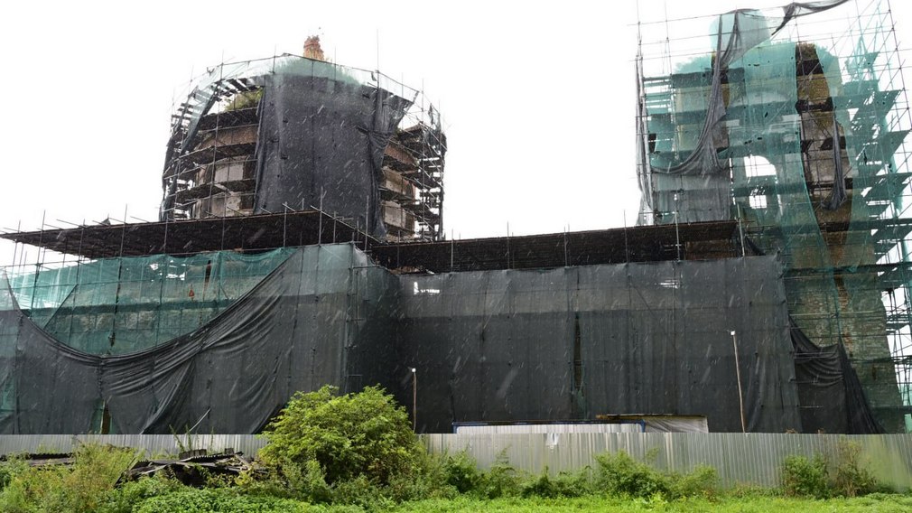 Когда начались реставрационные работы, крыша была полностью утрачена, кирпичная кладка в сводах центральной части разрушена, главный купол отсутствовал. По всему зданию кирпич был потерян на 40-50%, оконные проемы повреждены, колокольни не было.