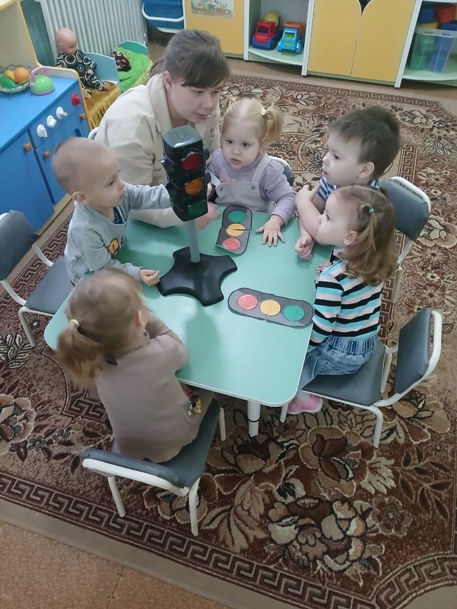 В МБОУ Дубровской № 1 СОШ им. генерал — майора Никитина И.С. в первой младшей группе воспитатель Пальцева В. А. провела с детьми беседу на тему: «Знакомство со светофором». Виктория Андреевна познакомила детей с понятием «светофор», который регулирует движение с помощью световых сигналов. Рассмотрели и закрепили, что означает каждый цвет. Красный — запрещающий движение, желтый цвет — призывающий к осторожности, и зеленый — разрешающий ехать. Ребята закрепили свои умения различать и называть цвета светофора в игре «Собери светофор», и правила поведения на дороге.