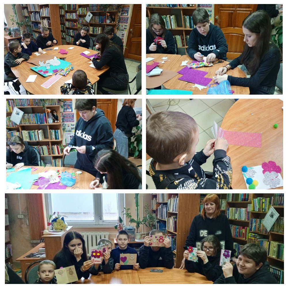В преддверии Международного женского дня воспитанники Отделения помощи семье женщинам и детям со стационаром ГБУ КЦСОН Дубровского района посетили Дубровскую детскую библиотеку, где для них был проведён мастер-класс по изготовлению праздничных открыток.