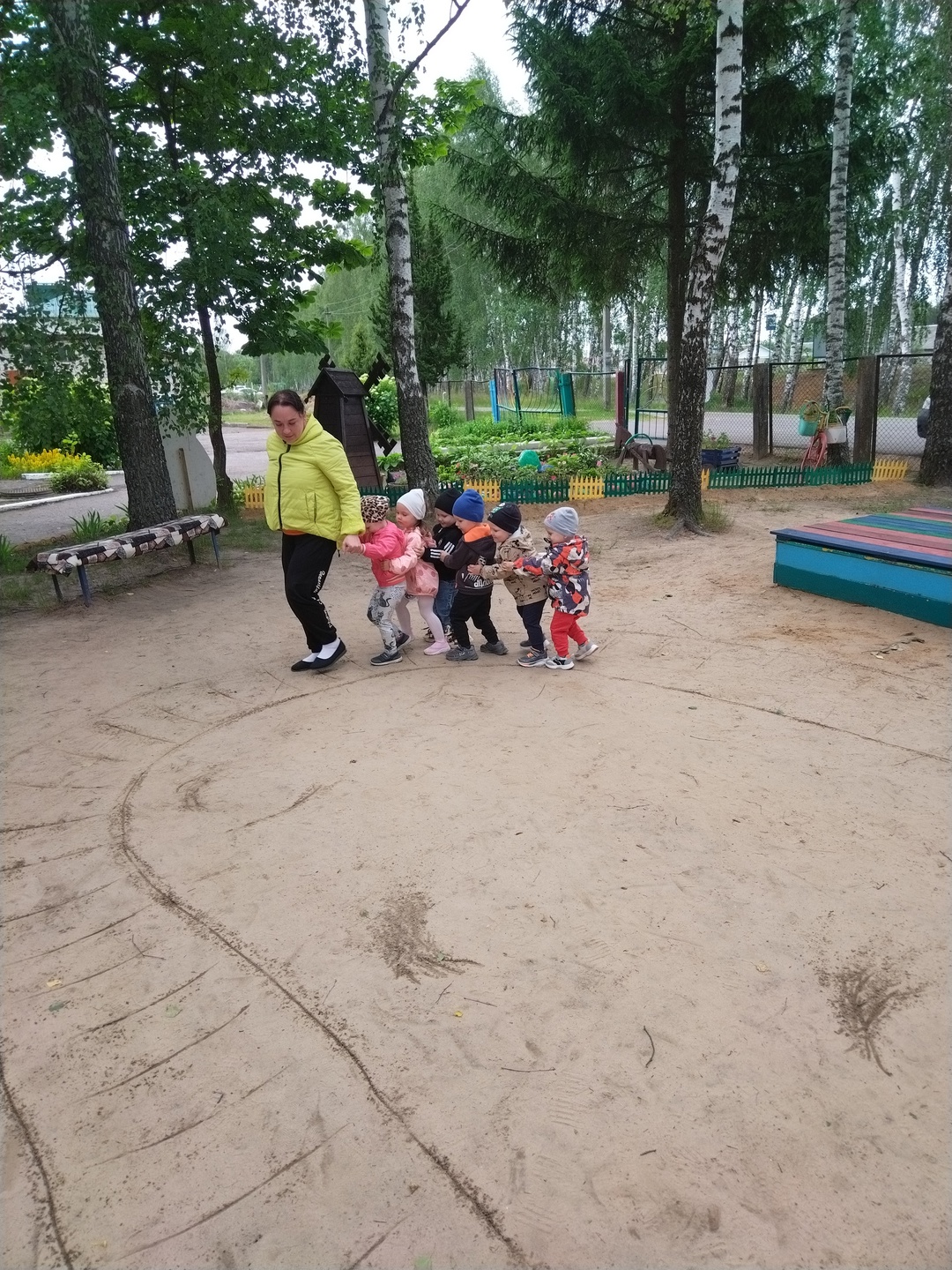 24 июня малыши группы «Светлячки» на прогулке играли в подвижные игры «Паровозик», «Побежали по дорожке».