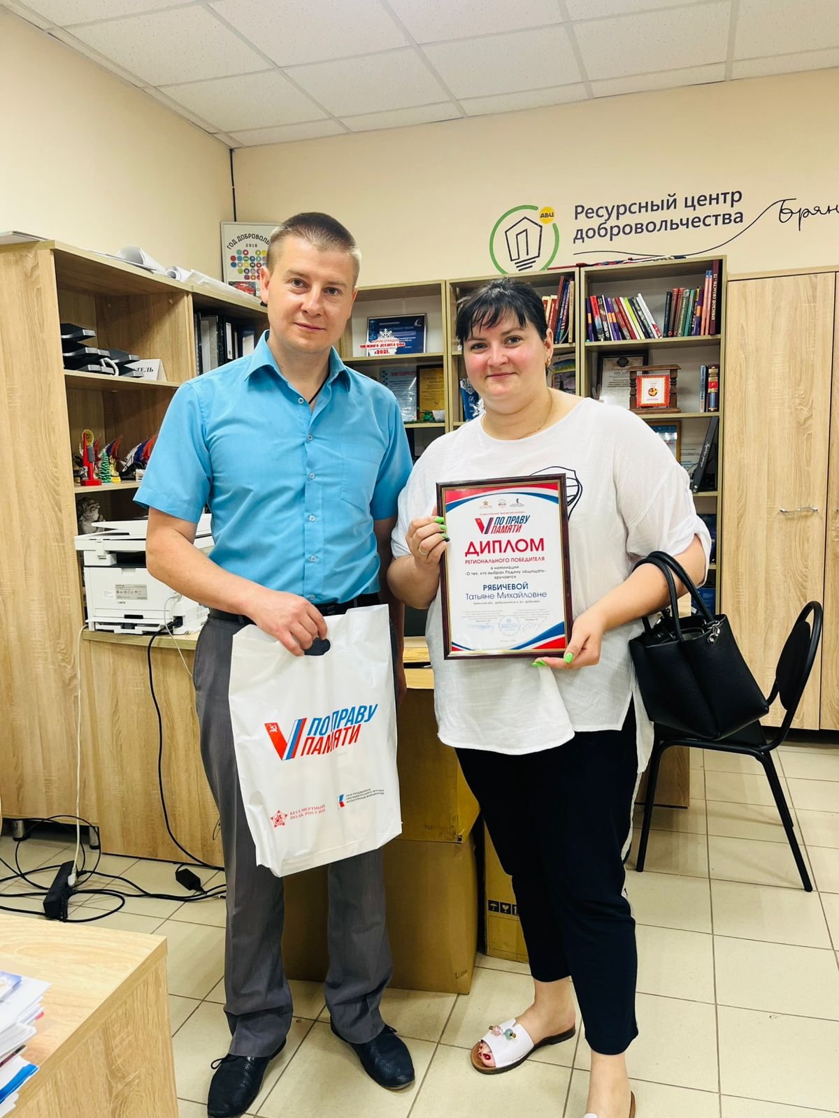 11 июля в Управлении молодёжной политики Брянской области советнику директора по воспитанию МБОУ Дубровской №1 СОШ Рябичевой Татьяне Михайловне был вручен Диплом регионального победителя Всероссийского творческого конкурса «По праву памяти» в номинации «О тех, кто выбрал Родину защищать». Организатором Конкурса выступило Общероссийское общественное гражданско-патриотическое движение «Бессмертный полк России» совместно с Ассоциацией ветеранов СВО при поддержке Президентского фонда культурных инициатив.